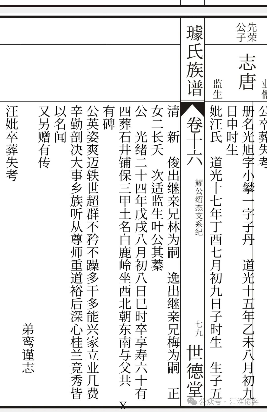 志唐祖父承镰公乾隆二十八年生,嘉庆元年卒(1763—1796年)年仅33岁,夫人章氏乾隆三十五年生,其夫卒时仅26岁,已育有三子,其中之坚辛非常人能承受,璩氏两代孺人让人敬重,章孺人旌表节孝从祀邑祠(旌表节孝是指官方对坚守节操的妇女和实行孝道的人进行表彰,并将其从祀于邑祠“地方祠堂”中。)