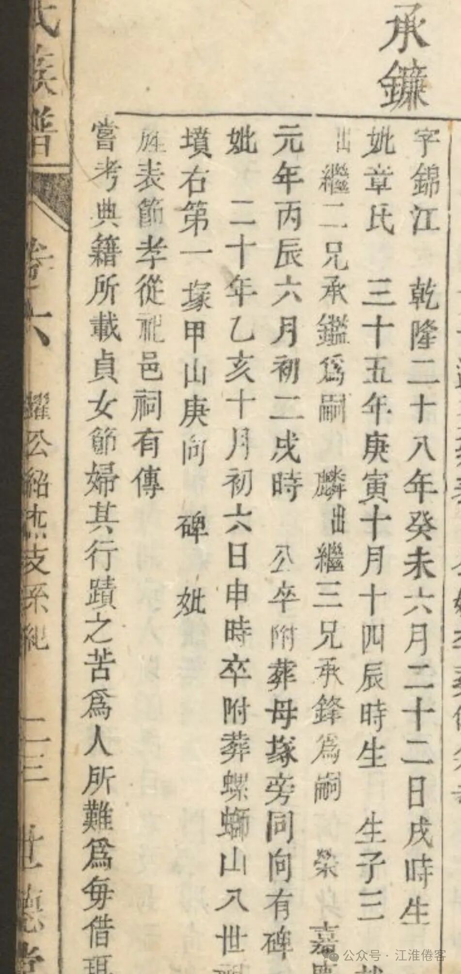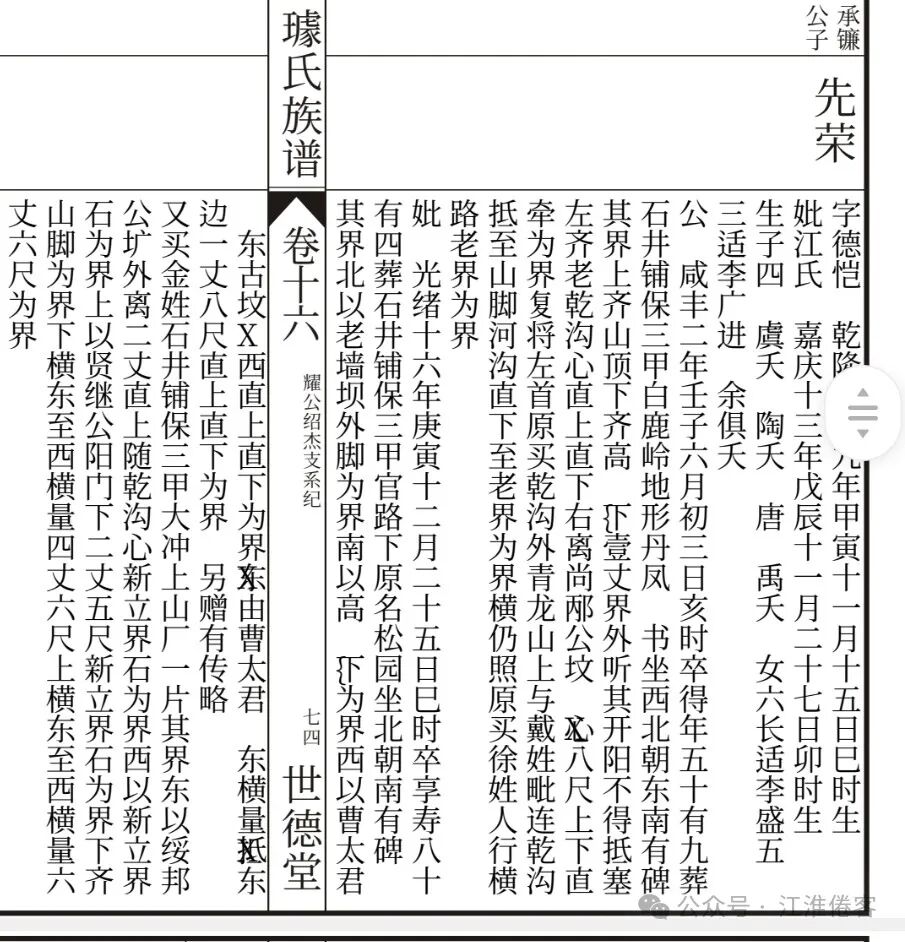志唐祖父承镰公乾隆二十八年生,嘉庆元年卒(1763—1796年)年仅33岁,夫人章氏乾隆三十五年生,其夫卒时仅26岁,已育有三子,其中之坚辛非常人能承受,璩氏两代孺人让人敬重,章孺人旌表节孝从祀邑祠(旌表节孝是指官方对坚守节操的妇女和实行孝道的人进行表彰,并将其从祀于邑祠“地方祠堂”中。)