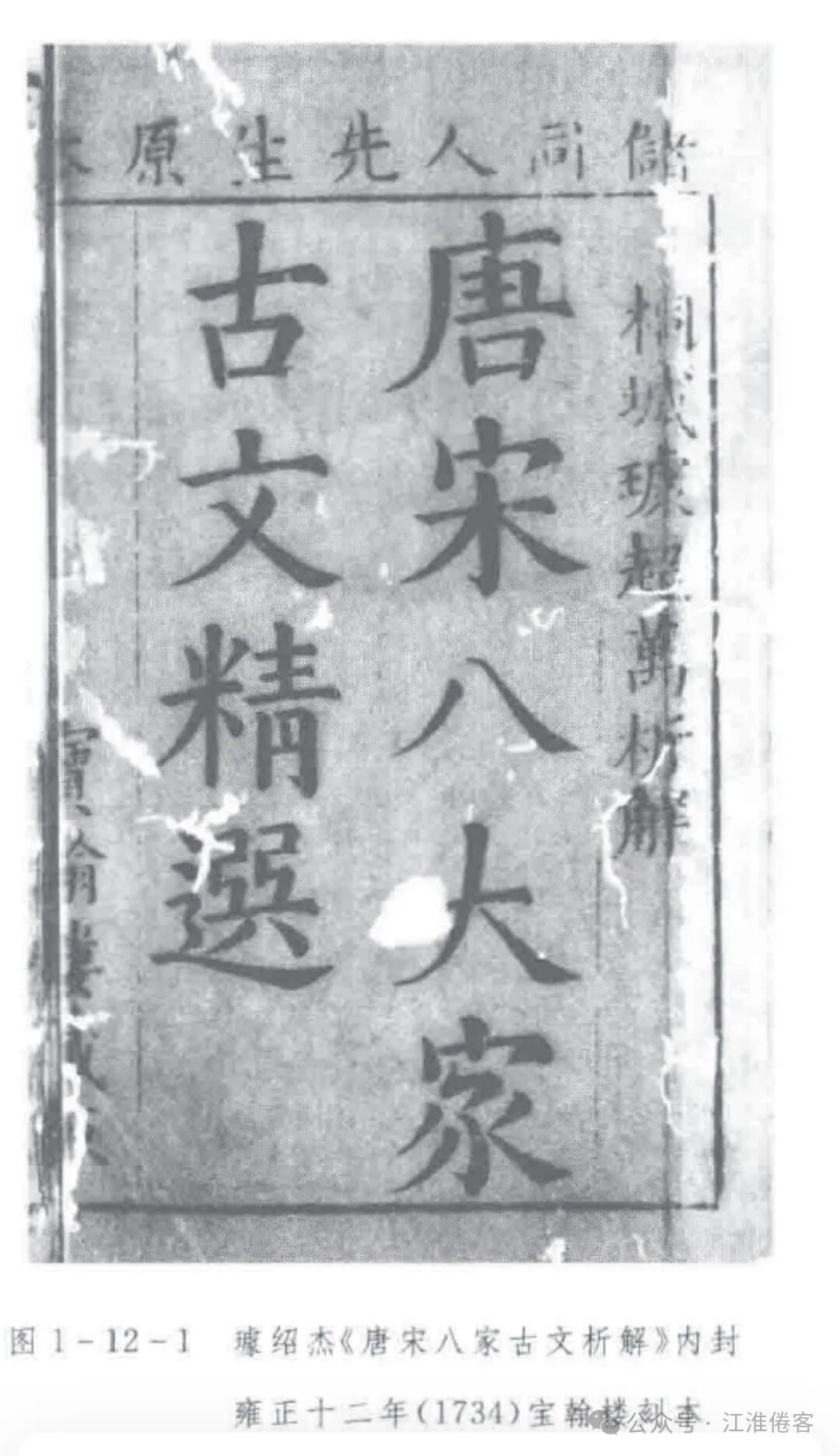 厦门大学图书馆所见璩绍杰《唐宋八家古文析解》十二卷,雍正十二年(1734)宝翰楼刻本(索书号:811/112)。共两册。上下双栏,下栏正文半叶九行二十字,上栏半叶十八行十字。四周单边,白口,单黑鱼尾,正文无界行。上栏有眉批,下栏正文有圈点和行间夹批,文后有末批。内封题“唐宋八大家古文精选,储同人先生原本,桐城璩超万析解,宝翰楼藏板”,卷首题“唐宋八家古文析解卷之一,桐城璩绍杰超万评选,韩文”,版心题“唐宋八家古文析解,卷之一”。全书结构依次为内封、周大璋序、璩绍杰自序、凡例、唐宋八家古文析解卷之一。周大璋序署“雍正十二年岁次甲寅仲夏之吉,同里周大璋撰”,首页右下铃“宝翰斋”长方朱印及“厦门大学图书馆藏书印”长方紫印。璩绍杰序署“雍正甲寅孟夏朔日桐城璩绍杰超万氏书于觉林精舍”。戴名世弟子尤云鹤在苏州设有书坊,名宝翰楼,刻书甚夥。康熙五十年(1711)《南山集》案发,尤云鹤受到牵连,书坊一度衰落。璩氏选本所铃“宝翰斋”朱印与内封“宝翰楼”有别,其雕版风格与尤云鹤宝翰楼所刻也大为不同,大概并非尤氏宝翰楼所出。璩绍杰此选传世甚少,厦大藏本有雍正时期书坊所铃“宝翰斋”印记。